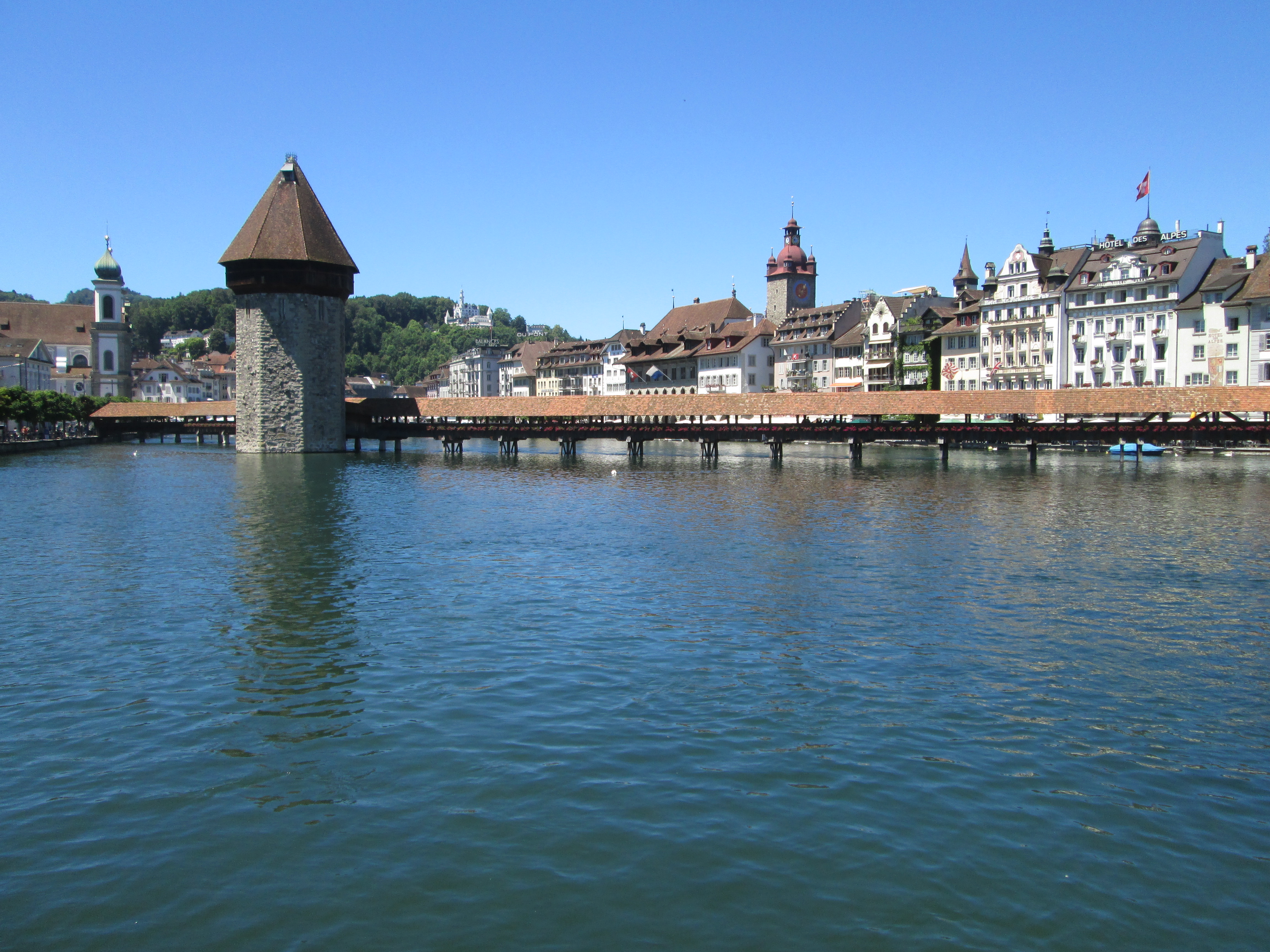 Lucerne is on a beautiful lake and has hills and mountains right on the doorstep, but with only a few hours to spend, we stayed in the town. The photo above shows the wooden Chapel Bridge, which burned almost completely in the 1990s and was rebuilt afterwards. I saw it the following year when it was still new and somehow gauche-looking, but now it’s weather-beaten and ‘old’ again – much better!