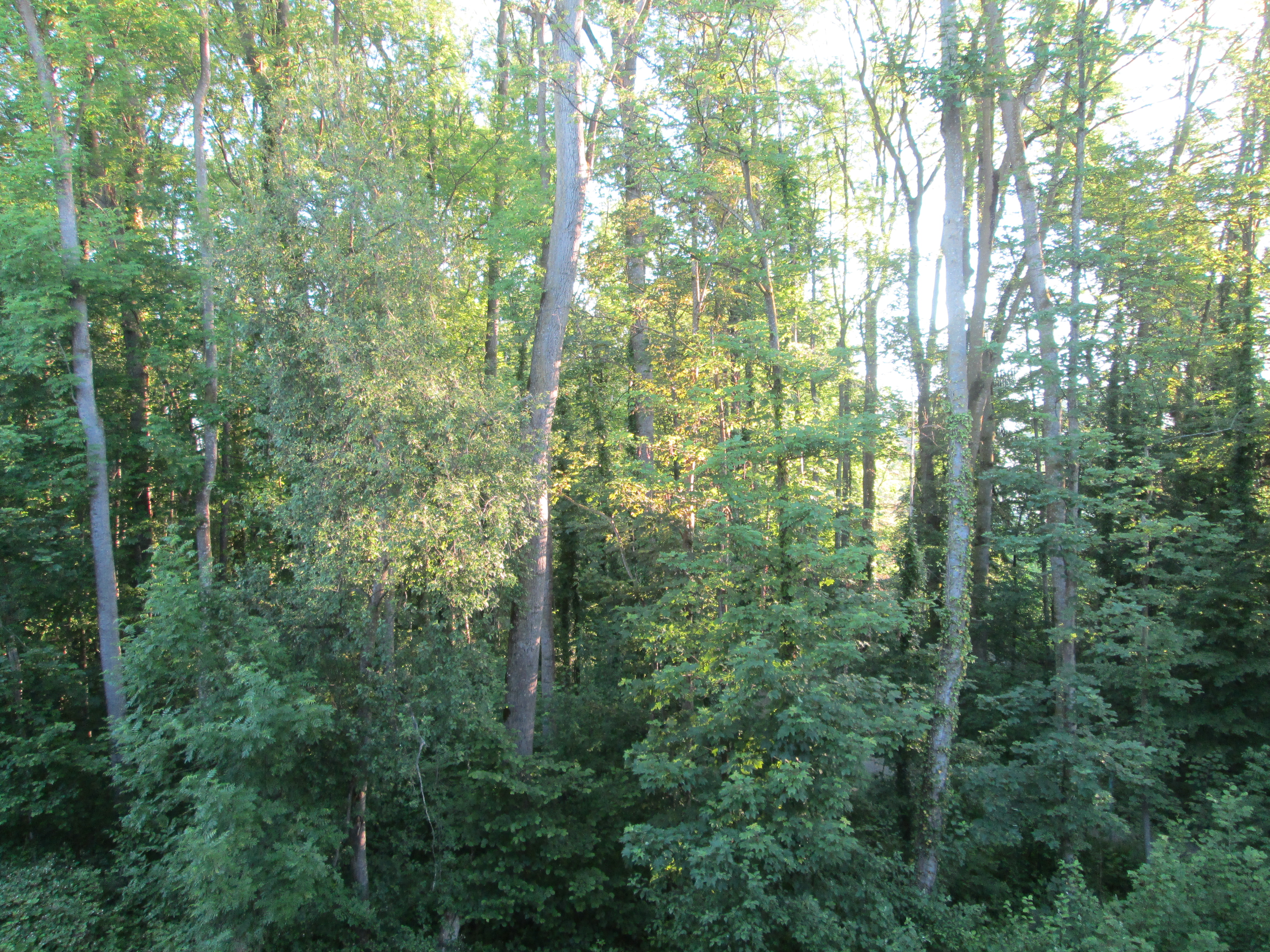 At long last we’re getting shorts and t-shirts weather here in N.E. Switzerland, and it’s lovely. Breakfast on the balcony overlooking the woods, birds singing and wasps buzzing – okay, maybe I could do without the buzzing wasps. Here’s a sunshine pic of the woods today, at 6.42 a.m. exactly.