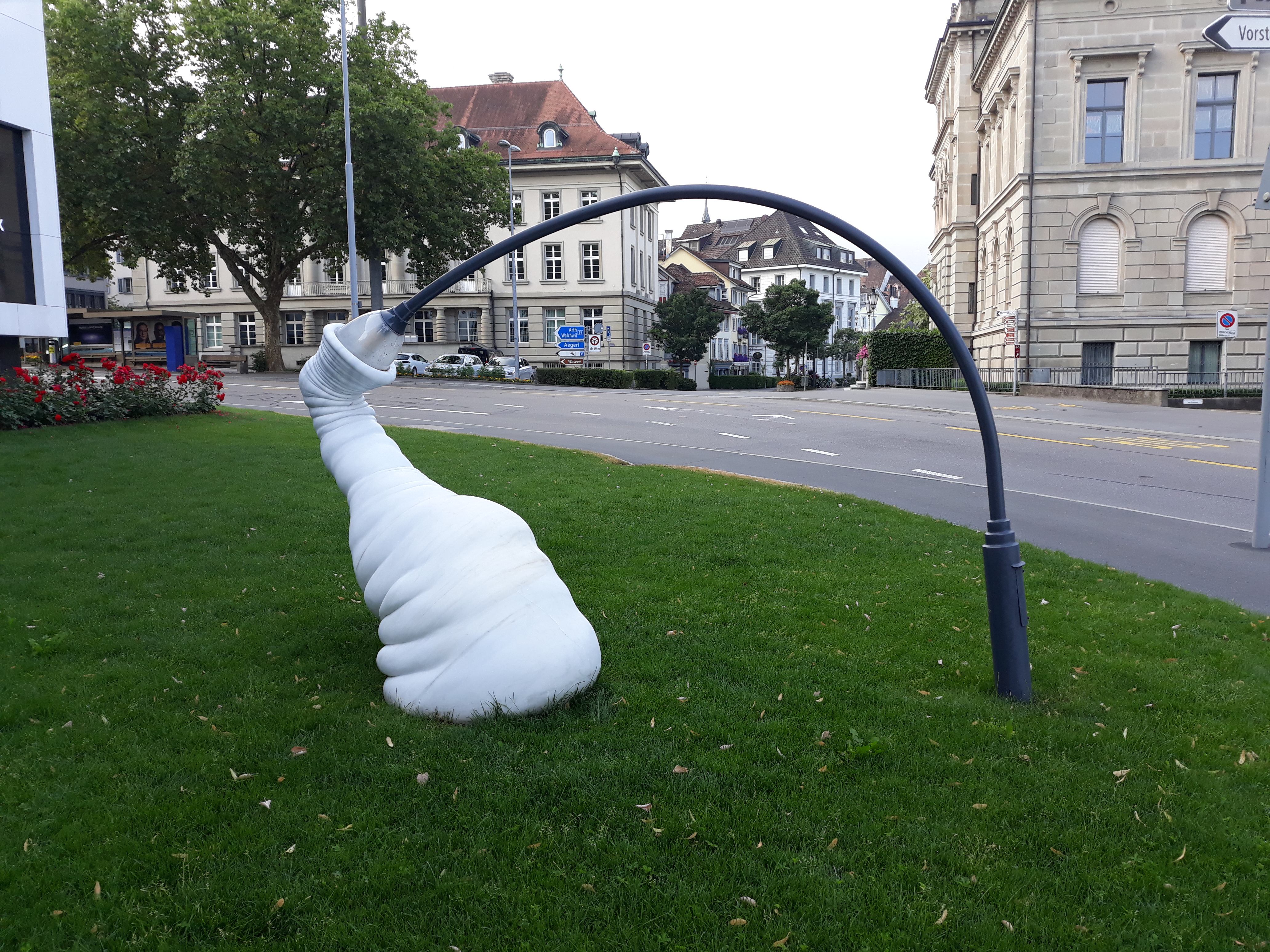 On Friday and Saturday I spent a few hours in Zug, Central Switzerland, on the way to and from Louise Mangos’ Strangers on a Bridge launch do. There’s a lot to like in Zug – a beautiful lake, a lovely historic old town – and some artwork.