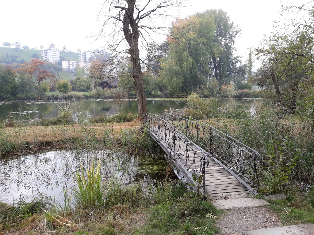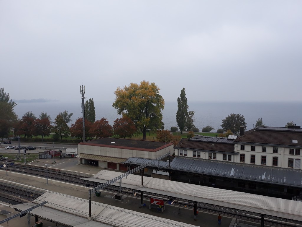 A couple of weeks ago, a friend and I took ourselves on a trip to the island of Ufenau, near the south end of Lake Zürich. Early-morning haze was hanging in the air as I stood waiting for the train at our local station, which isn’t much bigger than a bus stop. Lake Constance is behind those trees and bushes, but it was one of those mornings when you couldn’t see Germany on the other side.