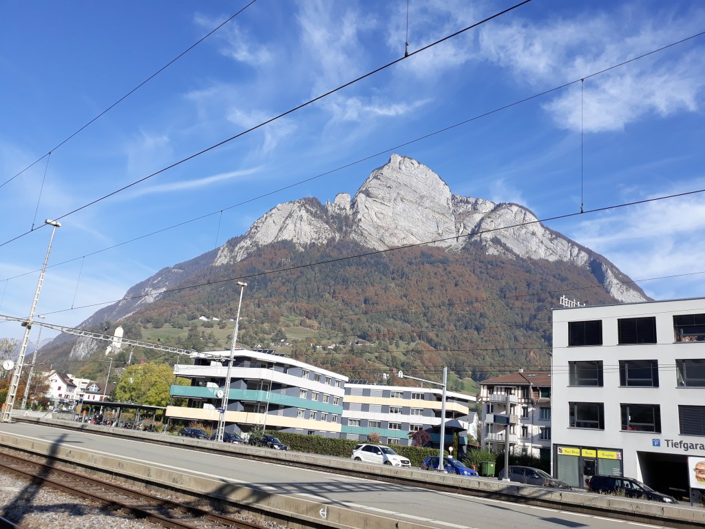 Train number two took us south, up the Rhine Valley to Sargans, and now the sun had come out. The peak there is Gonzen, a baby at 1830m high.