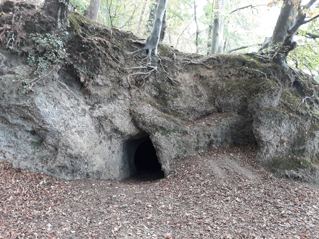 The sun was stuggling through again as we arrived there, and first of all we walked round the park, which boasts a castle, a cave, and a little lake with a lovely wood and iron bridge.