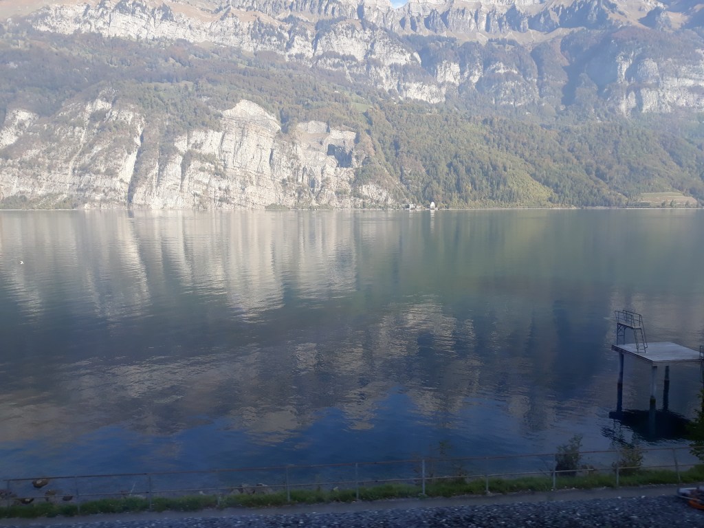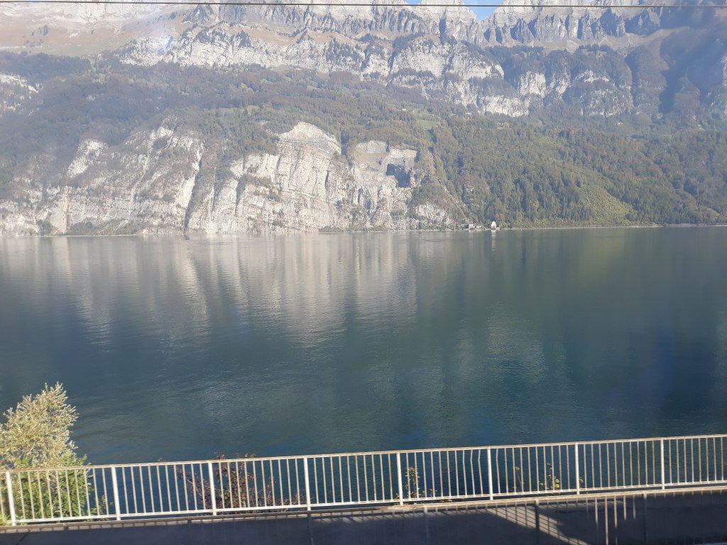 Sunshine accompanied us on train three, heading west now along the banks of the Walensee. You can tell by the photos below that train three had nice clean windows.