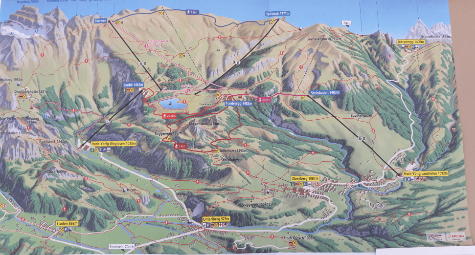 It was a lovely day when my friend and I arrived, but clouds were gathering and we decided to do our walking before they gathered too vigorously. Off we set in the bus to Hoch-Ybrig, where there are a multitude of chairlifts and trails. (We started out at the yellow-labelled lift on the right, and did a series of up, down and along hikes and rides to end up at the yellow Hoch-Ybrig station on the left.)