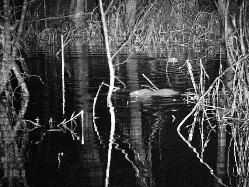 Son 1 took this over Christmas when he went down through the woods by our flat in the wee small hours with a night-vision camera. Pre-beavers, that pond was a little stream you could jump across.