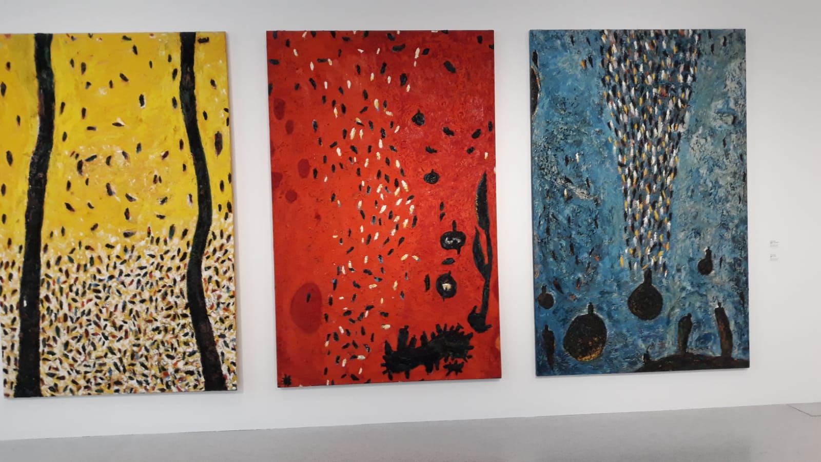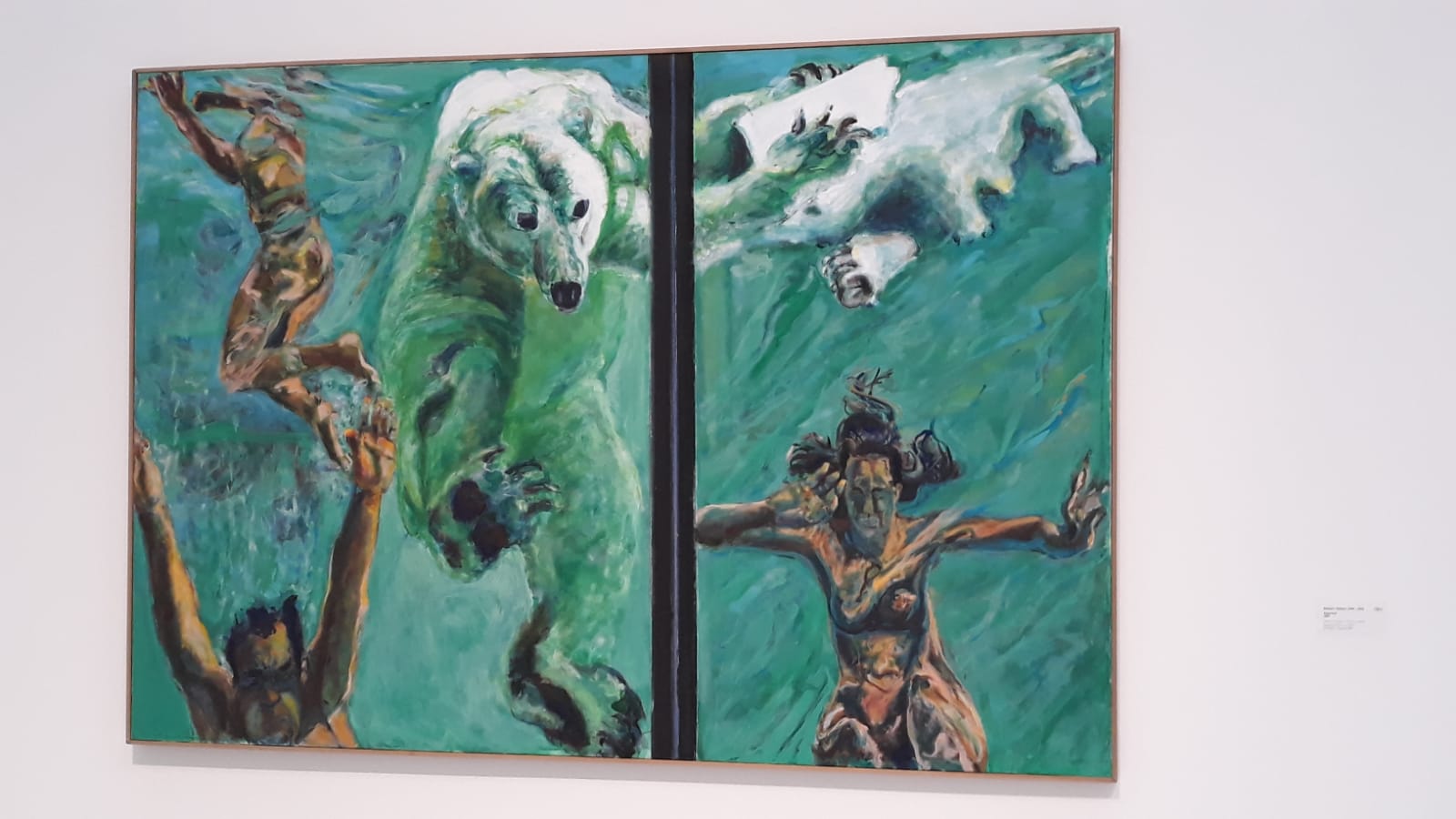 The following day was 34°, even hotter, and we took the train up the lake to Rorschach. There weren’t many people about, but we went up the hillside here too, in a glass lift this time. A photo stop at the top, then we came down to take refuge in the coolness of the Würth Gallery, where there’s a Wasser Wolke Wind exhibition (water, cloud, wind) as well as some work by Austrian artist Gunther Damisch. (And the day after this, my visitor from Scotland went back to 13° on the west coast…)