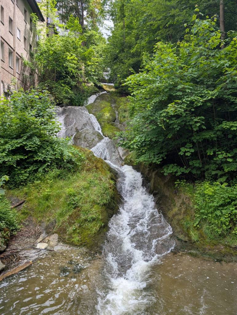 These next pics are a walk we took up a little gorge the same day. It was what you might call steep, but it was lovely walking by the river as the water crashed down. A couple of hunded yards downhill, that river – the Steinach – passes right underneath St Gallen Cathedral to re-emerge further downhill and eventually empty into Lake Constance.