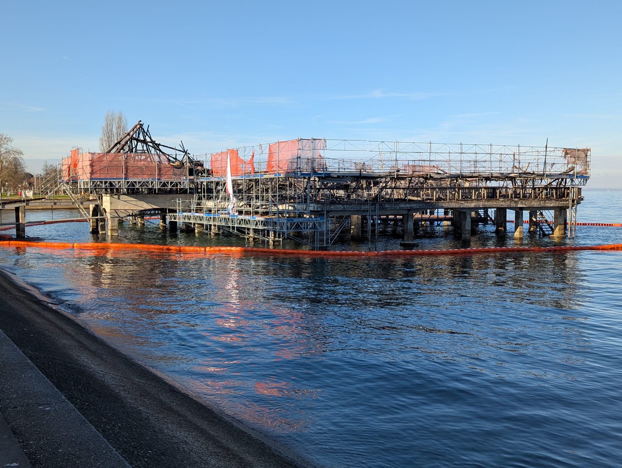 But then – in the night of 22nd-23rd December last year, one hundred years and six months after it was built, the bathing hut burned down. They’ve never found what caused the fire, which had completely engulfed the old wooden structure even before the fire brigade arrived. We went along a couple of days later, on the 25th (the equivalent of Boxing Day here in Switzerland, as the main Christmas event is on the 24th). We weren’t the only ones – half of N.E. Switzerland seemed to be on the promenade. The sense of loss was all around; some people even brought flowers.