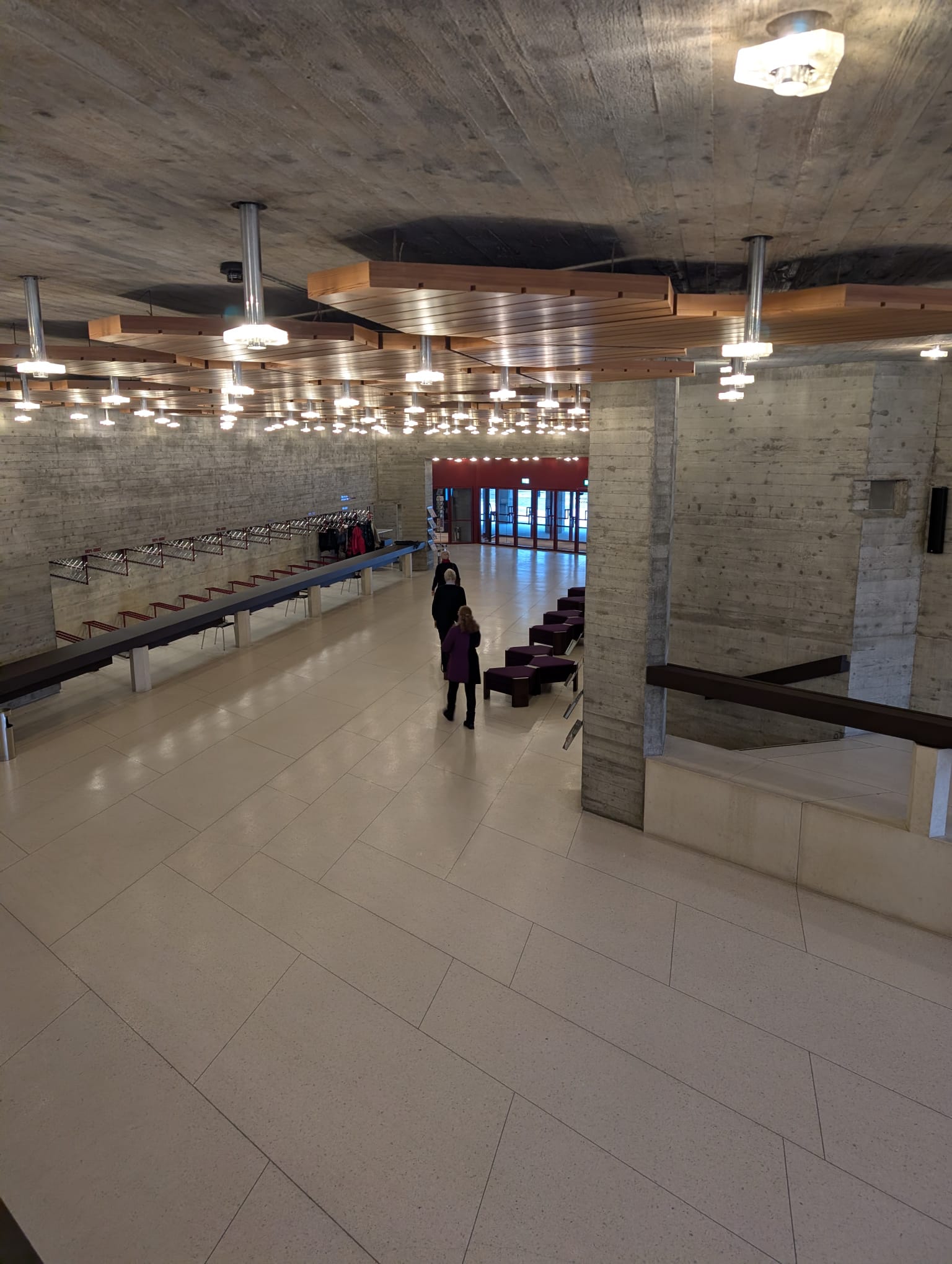 Make-up and costumes followed, then rehearsal rooms, then the staff cantine. By this time, we were moving up the ‘tower’ part of the building (see very top photo), and our last stop was the roof terrace, where the views over the adjacent park and the town were swathed in milky winter sunshine. I for one was glad to rest my legs after all that stair-climbing…